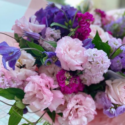 Большой букет с сиреневой гортензией и садовой розой: ароматный круглый букет