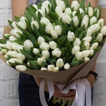 Букет белых тюльпанов (19 шт) в стильном оформлении «Весеннее настроение»