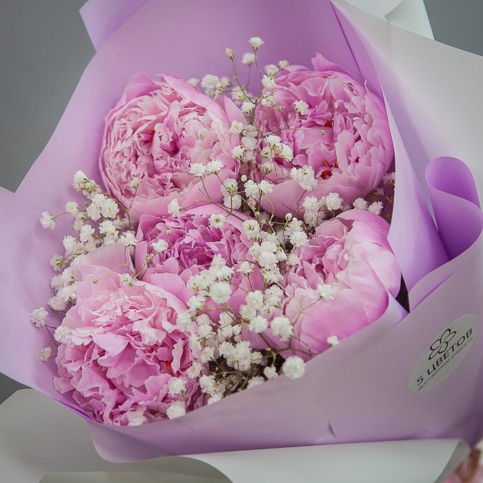 Гипсофила – 3 шт.Атласная лента – 1 шт.Упаковка матовая пленка – 1 шт.пионы розовые – 5 шт.