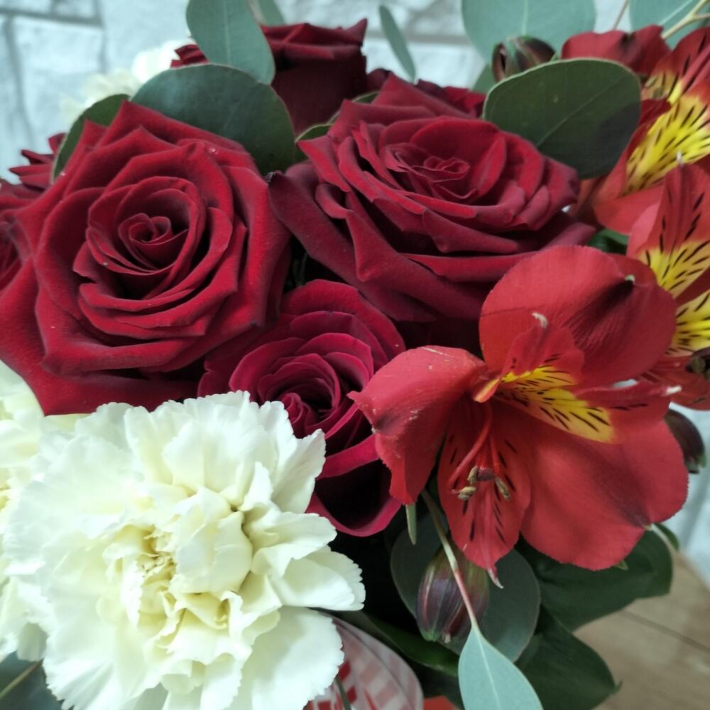 Роза Эквадор – 5 шт.Лента атласная – 1 шт.Гвоздика сортовая – 3 шт.Конус – 1 шт.Альстромерия Микс Европа – 1 шт.Эвкалипт Микс – 3 шт.
