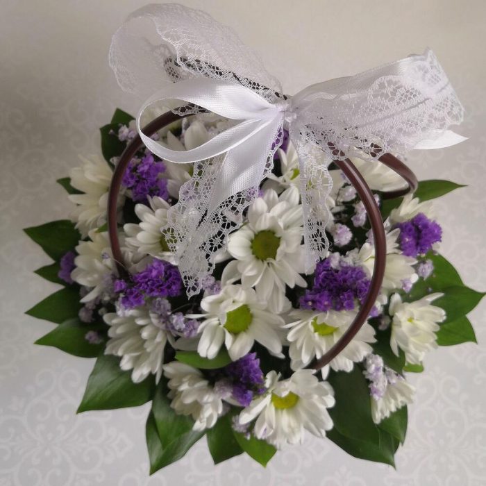Хризантема кустовая – 3 шт.Рускус – 4 шт.Статица синяя – 1 шт.Гипсофила – 1 шт.Сумочка – 1 шт.Оазис флористический – 1 шт.Бант – 1 шт.