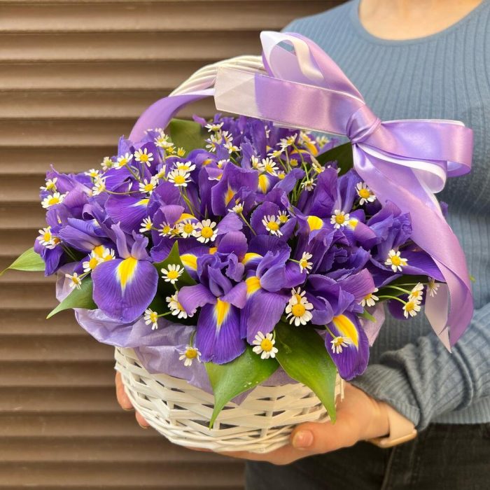 Ирис – 31 шт.Матрикария – 5 шт.Корзина плетеная – 1 шт.Оазис флористический – 1 шт.