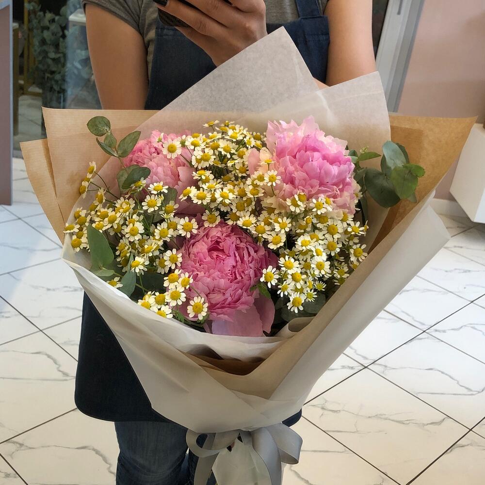 Пион – 3 шт.Матрикария (Ромашка Камила) – 5 шт.Эвкалипт – 1 шт.упаковка подарочная с лентой – 1 шт.Средство для продления жизни цветов – 1 шт.