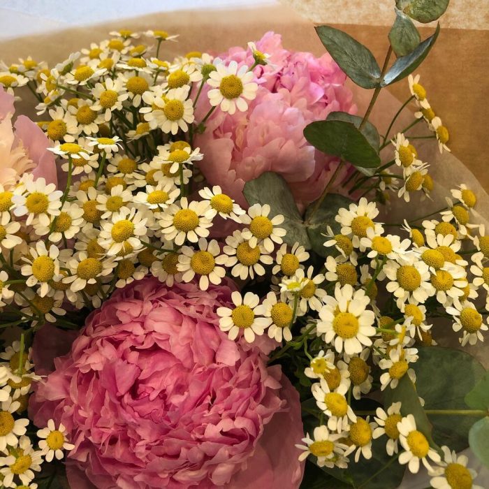 Пион – 3 шт.Матрикария (Ромашка Камила) – 5 шт.Эвкалипт – 1 шт.упаковка подарочная с лентой – 1 шт.Средство для продления жизни цветов – 1 шт.