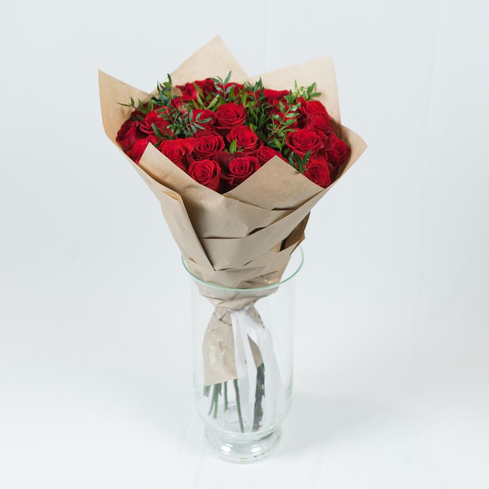 25 роз explorer PREMIUM 50 см в крафте с зеленью