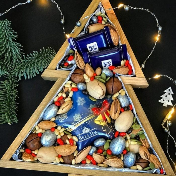 Шоколад – 2 шт.Чай – 100 гр.миндаль в скорлупе – 25 гр.макадамия – 50 гр.