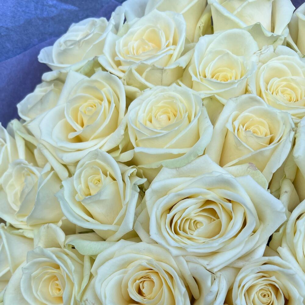 Роза белая 60 см – 31 шт.Дизайнерская упаковка – 3 шт.Тишью – 2 шт.Лента атласная – 2 шт.
