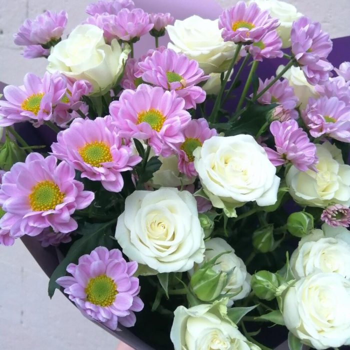 Лента – 1 шт.Роза кустовая – 3 шт.Хризантема Сантини – 4 шт.Упаковка – 1 шт.