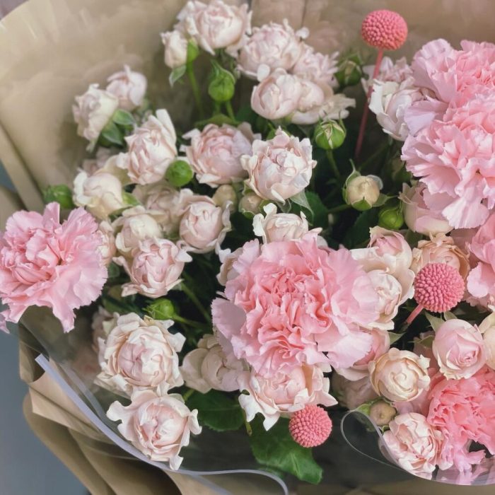 Краспедия – 4 шт.Кустовая роза – 8 шт.Гвоздика – 7 шт.Лента атласная – 2 шт.Упаковка дизайнерская – 5 шт.