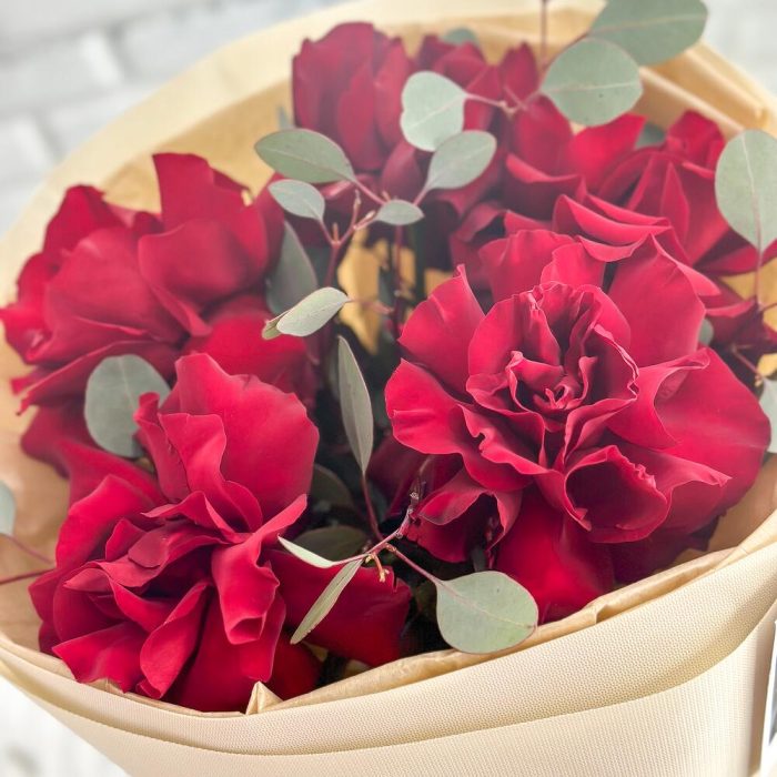 Эвкалипт – 1 шт.Лента атласная – 1 шт.Тишью – 3 шт.Роза Эксплорер – 5 шт.упаковка зефирка – 3 шт.