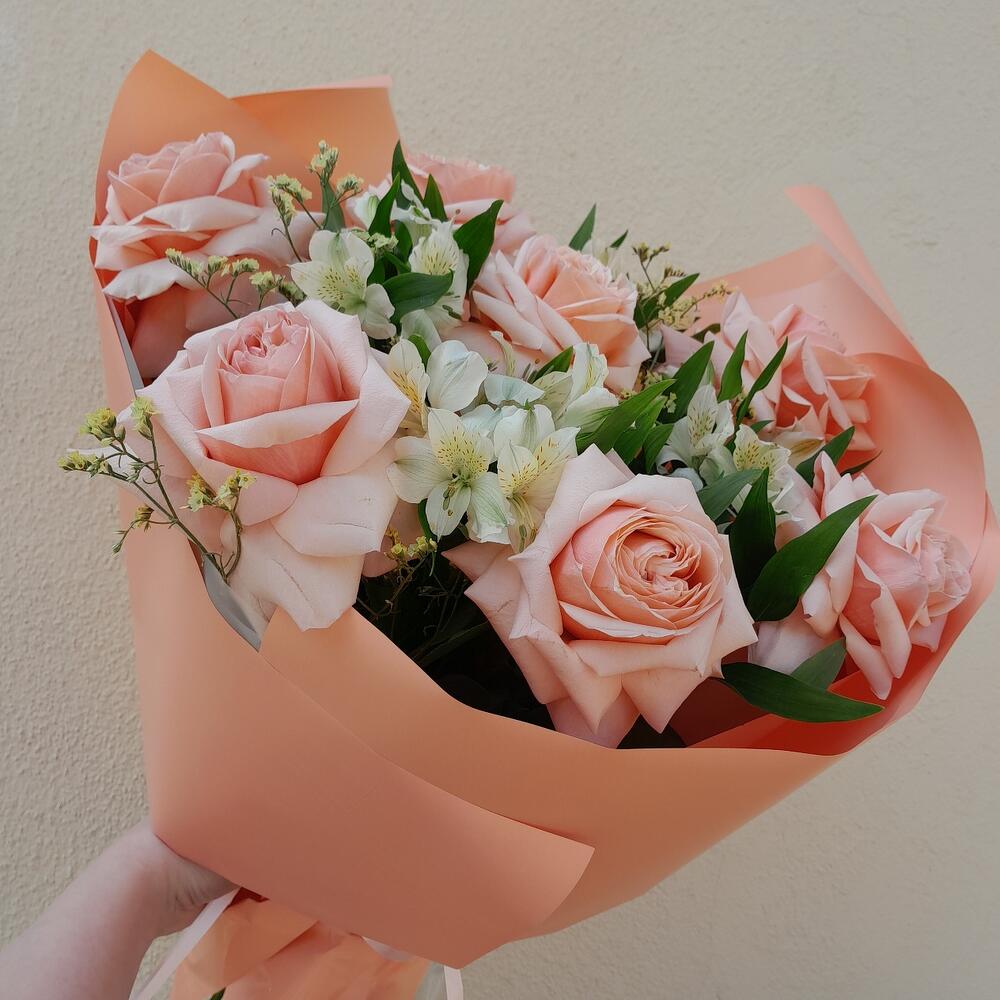 Альстромерия – 6 шт.Лимониум – 3 шт.Лента атласная – 2 шт.Упаковка дизайнерская – 3 шт.Роза французская – 7 шт.