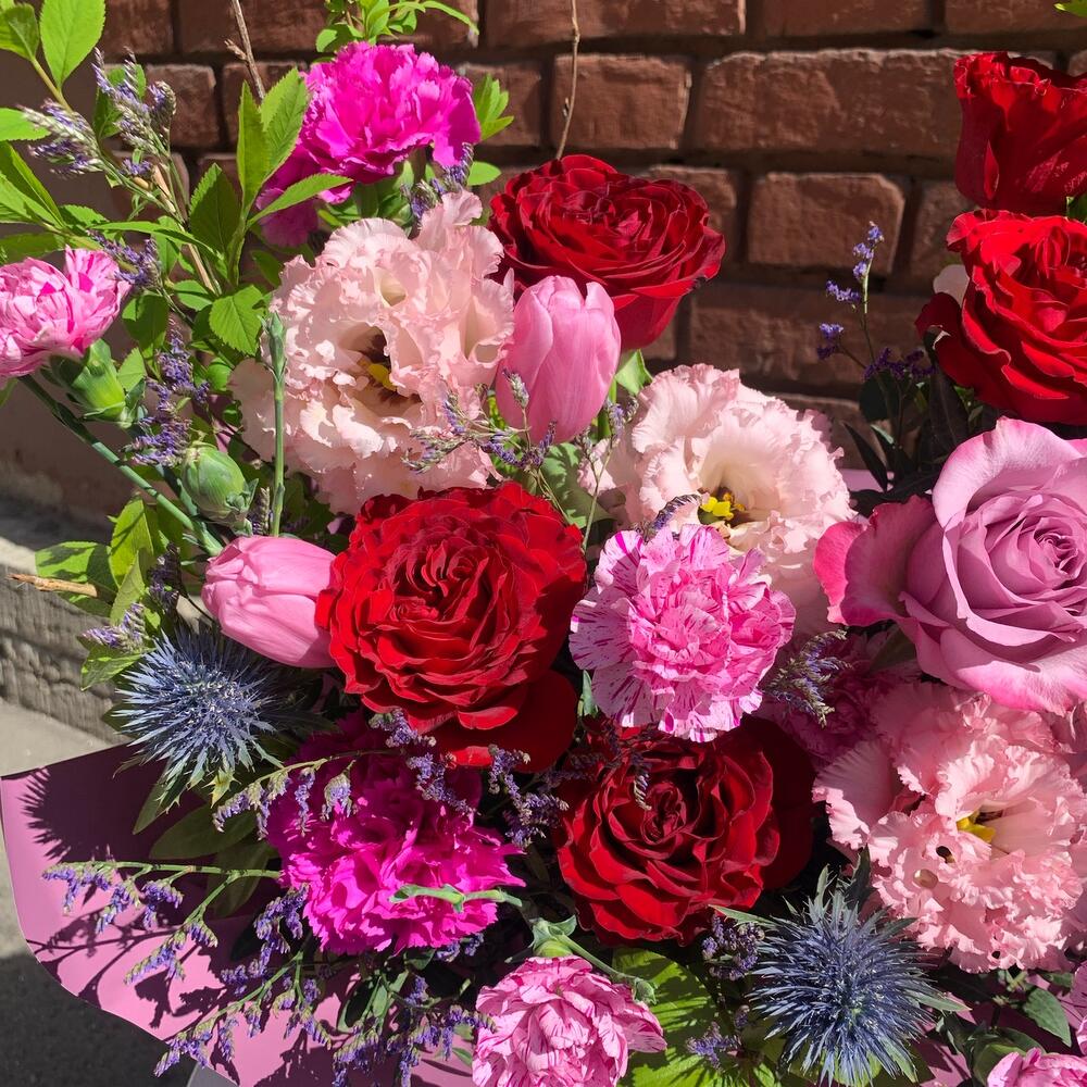 Категорий: Гвоздики, Кустовые розы, Лизиантусы, Пионовидные розы, Розы, Тюльпаны
