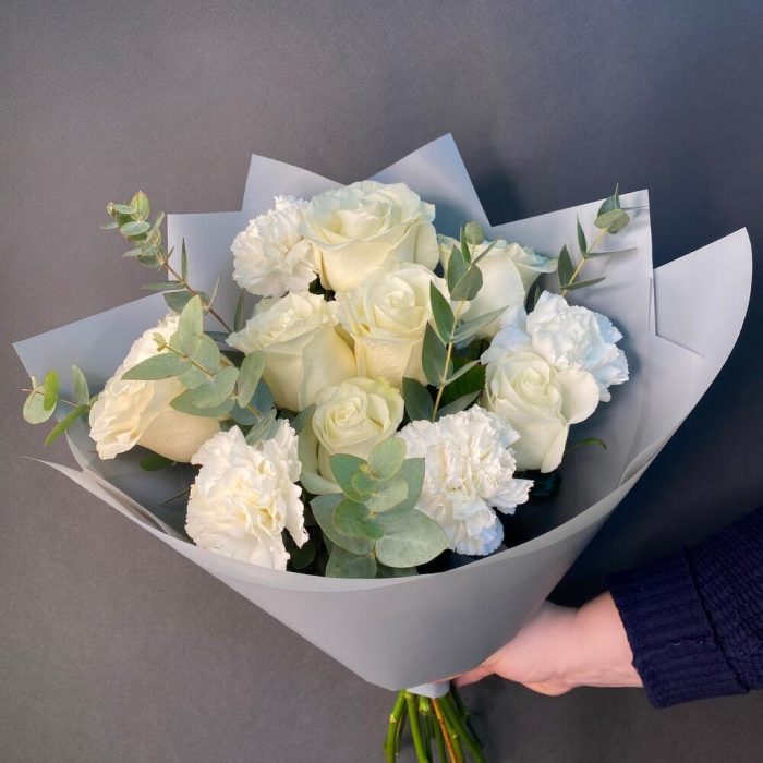 роза мондиаль белая – 7 шт.диантус белый сортовой – 4 шт.эвкалипт ценария большая ветка – 1 шт.Упаковка дизайнерская – 3 шт.