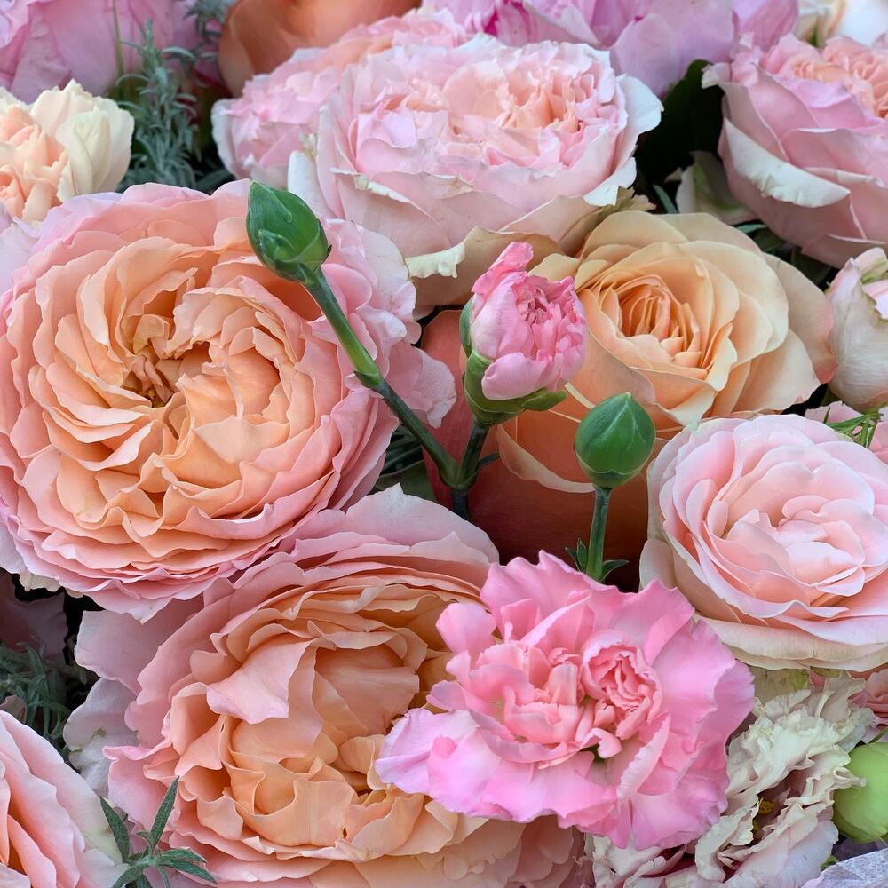 Лизиантус – 3 шт.Лента атласная – 1 шт.Диантус – 10 шт.Роза пионовидная – 3 шт.Роза кустовая пионовидная – 7 шт.Пион Сара Бернар – 2 шт.Упаковка дизайнерская – 2 шт.зелень декоративная – 7 шт.