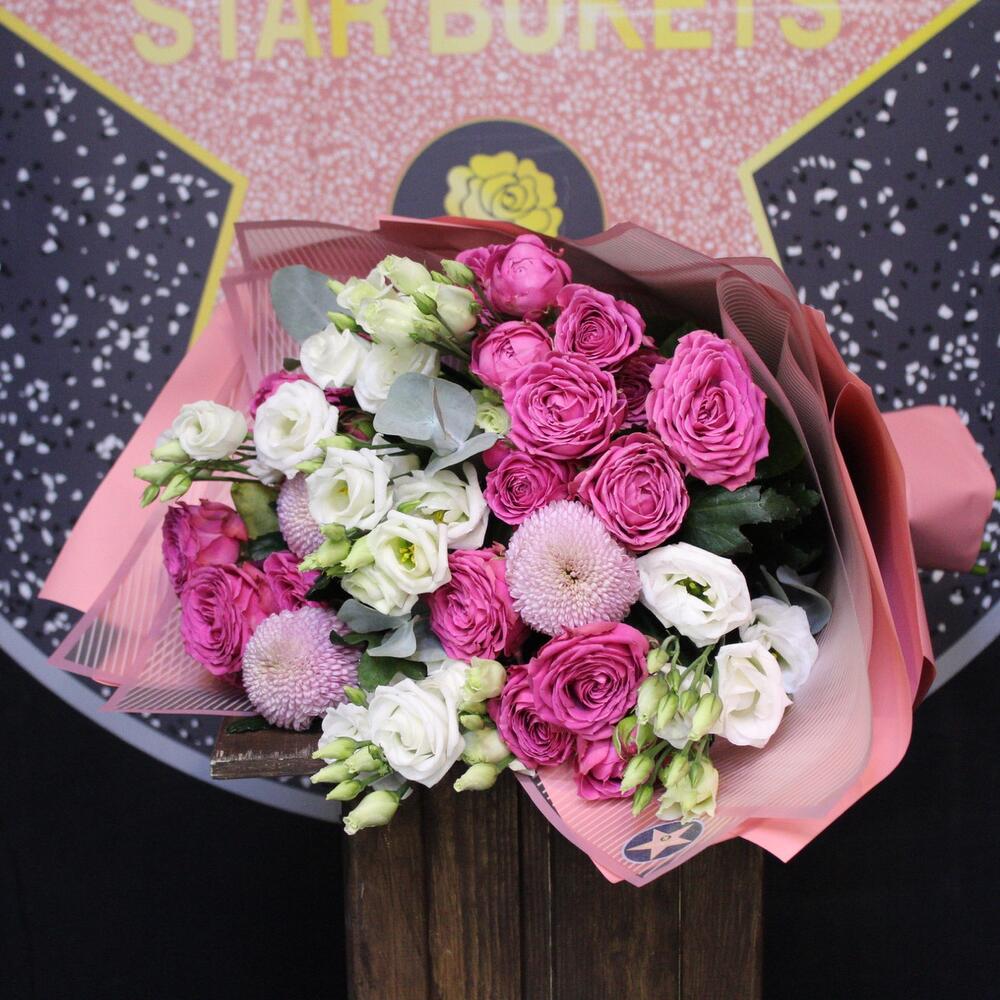 Категорий: Кустовые розы, Лизиантусы, Пионовидные розы, Розы, Хризантемы