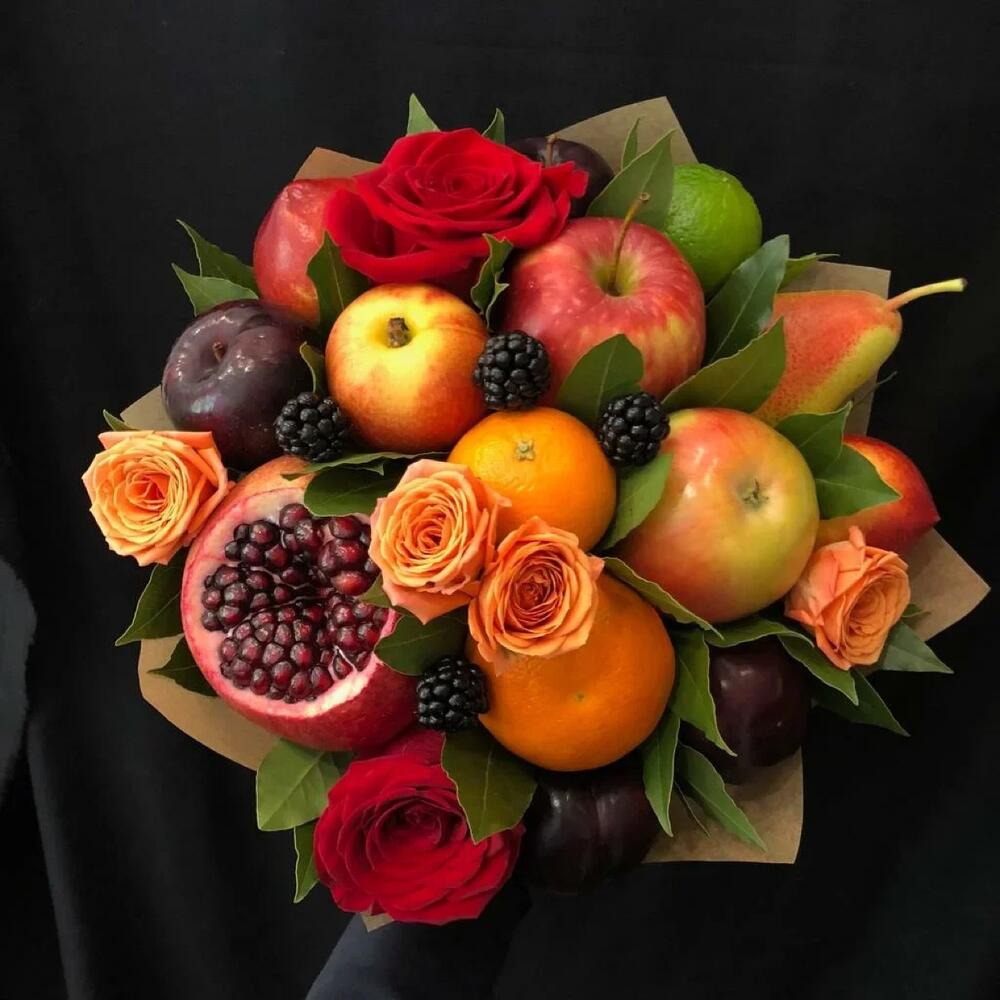 яблоки – 2 шт.груши – 2 шт.Нектарины – 2 шт.Сливы – 2 шт.Лайм – 1 шт.мандарины – 2 шт.Гранат – 1 шт.розы – 5 шт.Ежевика – 4 шт.Лавр – 10 шт.