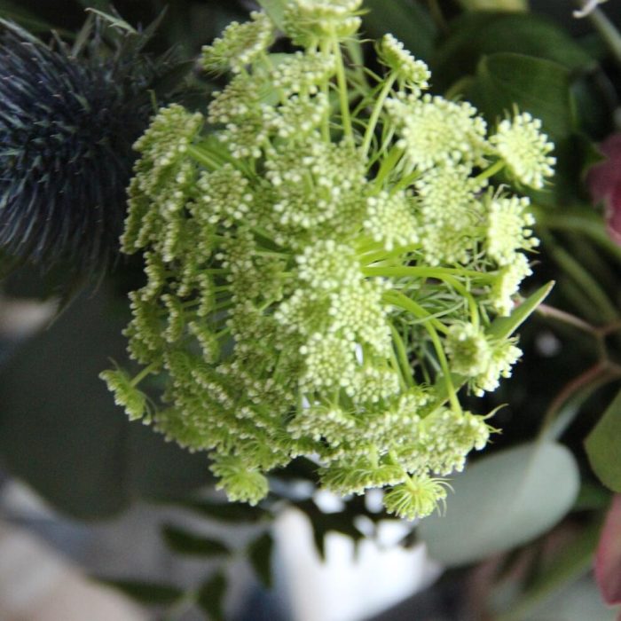 Садовый букет с лилиями, колючками, львиным зевом, хелеборусом, зонтиками, клематисом, флебодиумом и эвкалиптом.